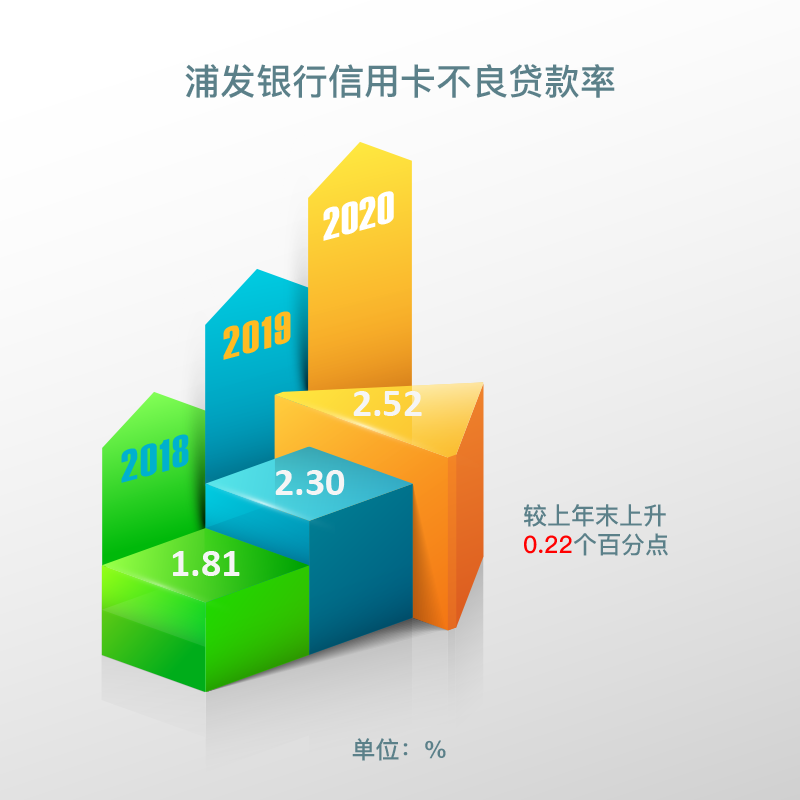 截至报告期末,浦发银行信用卡不良贷款率为2.52%,较上年末增加0.22%;截至2019年末浦发银行信用卡不良贷款率为2.30%;截至2018年末浦发银行信用卡不良贷款率为1.81%。
