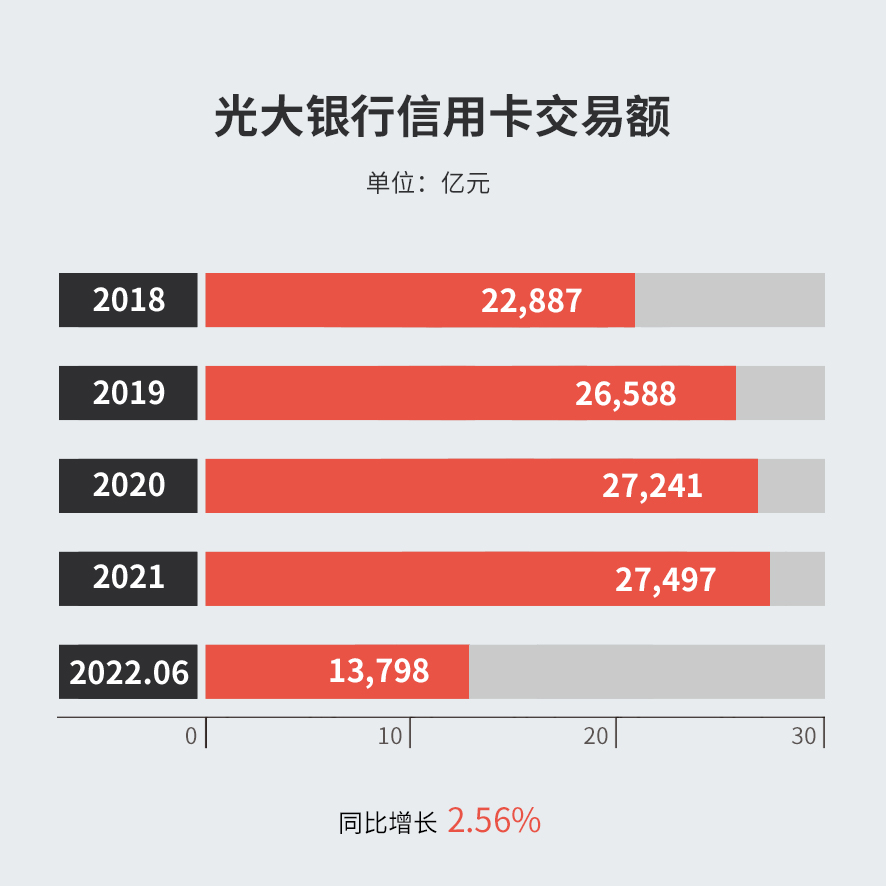 2022年上半年,光大银行信用卡总交易金额13,797.90亿元,同比增长2.56%。
