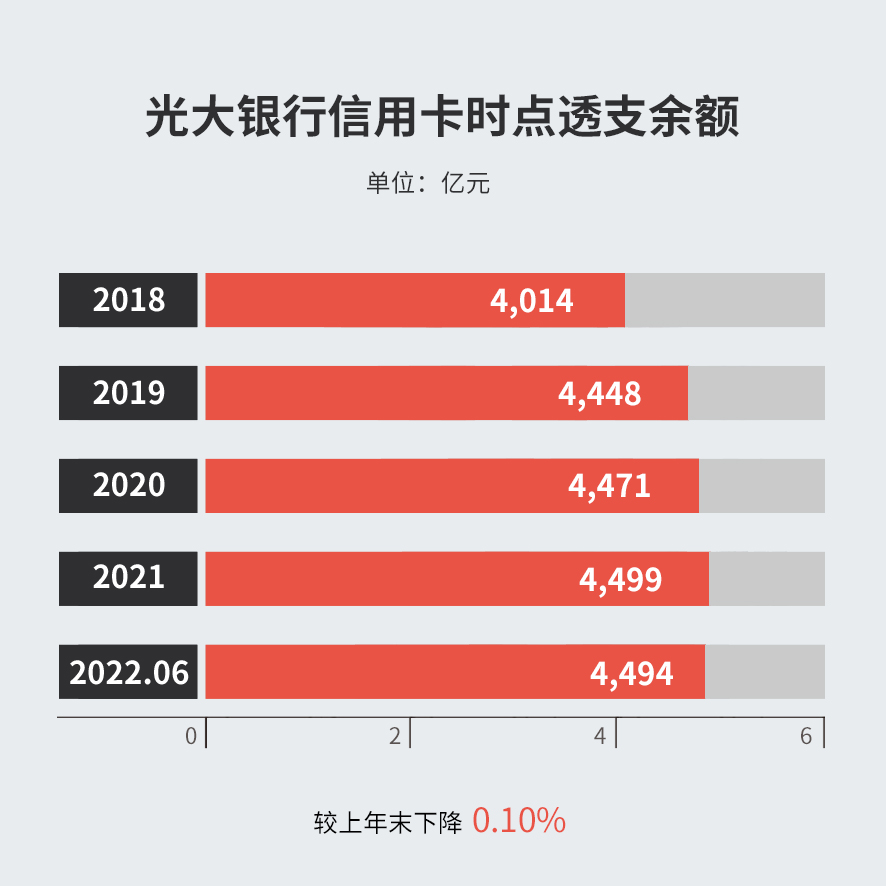 截至2022年6月末,光大银行信用卡时点透支余额4,494.17亿元,较上年末下降0.10%。