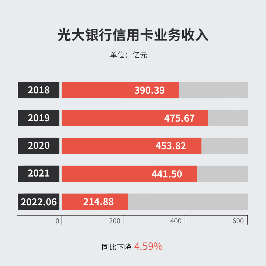 2022年上半年,光大银行信用卡实现业务收入214.88亿元,同比下降4.59%。