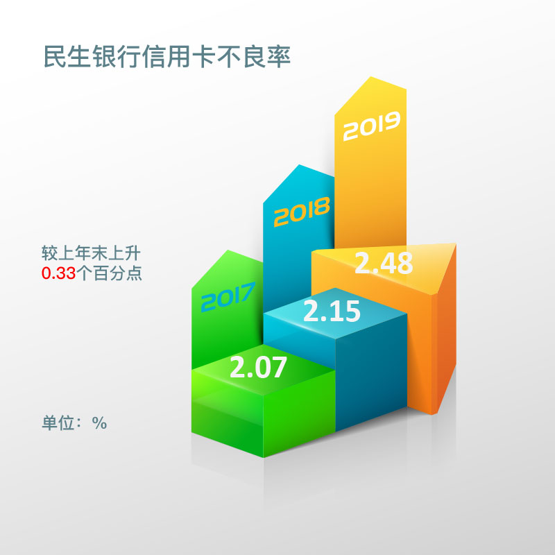 截至报告期末,民生银行信用卡不良贷款率为2.48%,较上年末上升0.33个百分点。截至2018年末民生银行信用卡不良贷款率为2.15%,截至2017年末民生银行信用卡不良贷款率为2.07%。