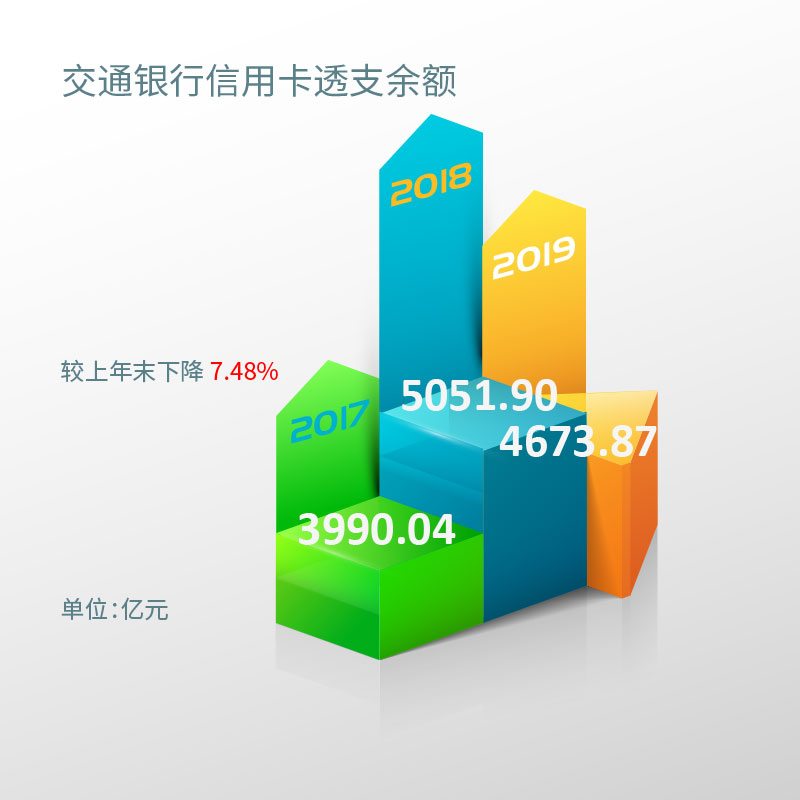截至报告期末,交通银行信用卡透支余额4673.87亿元,较上年末下降7.48%,截至2018年末交通银行信用卡透支余额5051.90亿元,截至2017年末交通银行信用卡透支余额3990.04亿元。