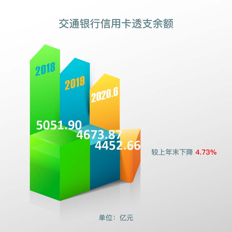 截至报告期末,交通银行信用卡透支余额4,452.66亿元,较上年末下降4.73%,截至2019年末交通银行信用卡透支余额4,673.87亿元,截至2018年末交通银行信用卡透支余额5,051.90亿元。
