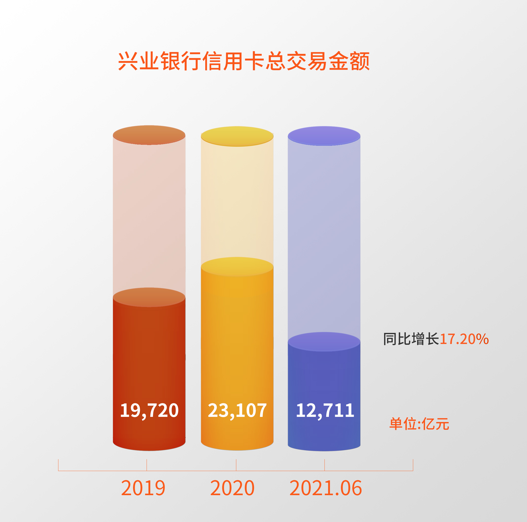2021年上半年,兴业银行信用卡总交易金额12,710.65亿元,同比增长 17.20%,。