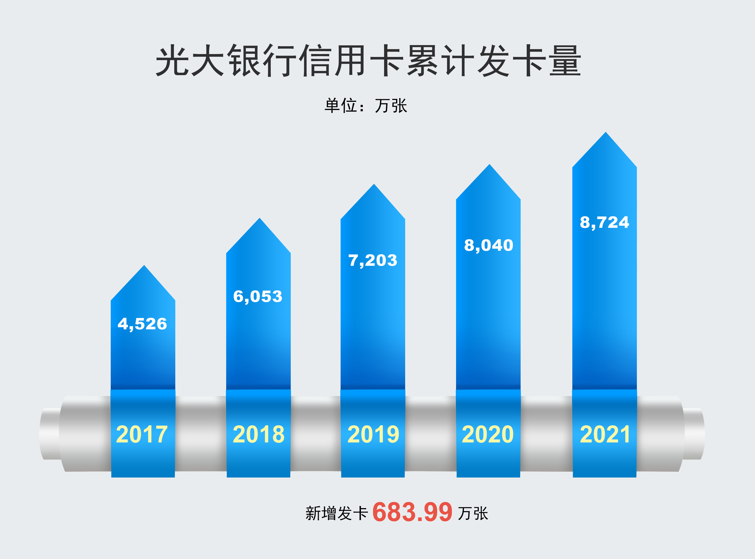 截至2021年末,光大银行信用卡累计发卡量8,724.26万张,较上年末增长8.51%,新增发卡 683.99 万张。