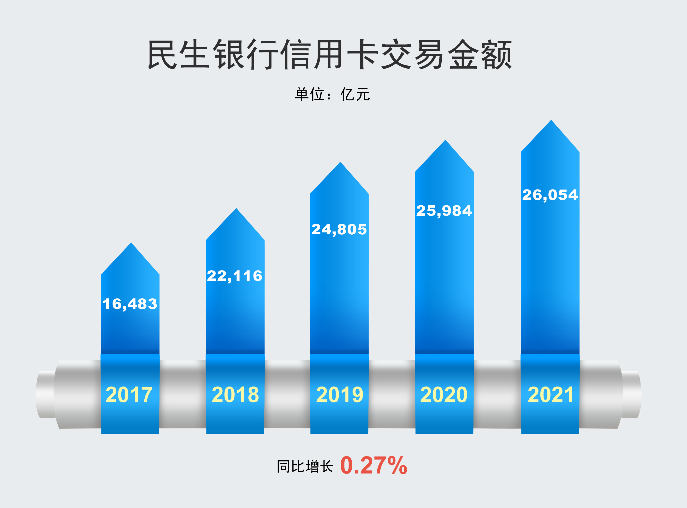 2021年,民生银行实现信用卡交易额26,054.39亿元,同比增长0.27%。
