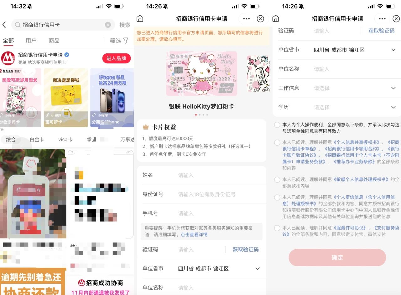 招商银行信用卡也有入驻小红书,并且开放了用户申请,但流程会比上述贷款业务更好。用户在小红书上点击申请信用卡后无需跳转,直接在小红书的小程序内部填写资料进一步完成申请。