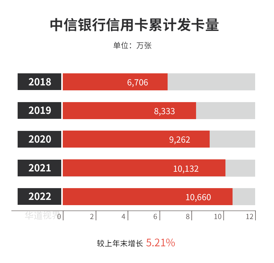 截至报告期末,中信银行信用卡累计发卡10,660.29万张,较上年末增长 5.21%;