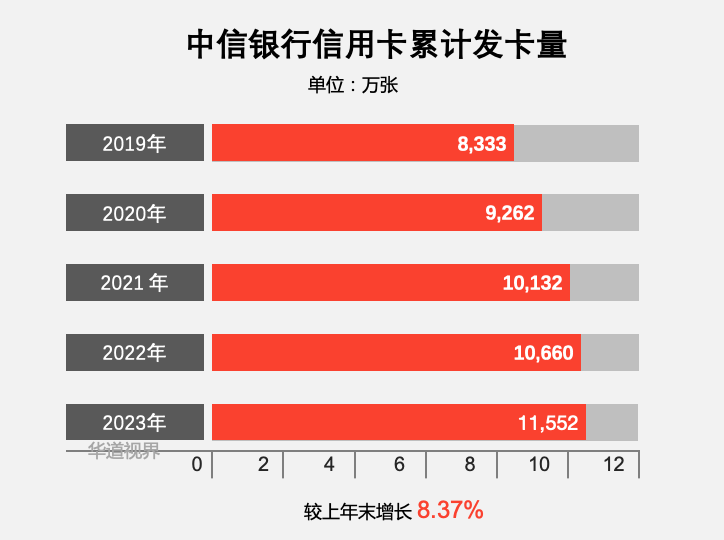截至2023年末,中信银行信用卡累计发卡 11,552.06 万张,较上年末增长 8.37%;