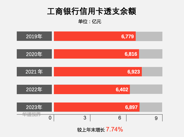 截至2023年末,工商银行信用卡透支余额 6,897.31 亿元,较上年末增长7.74%;