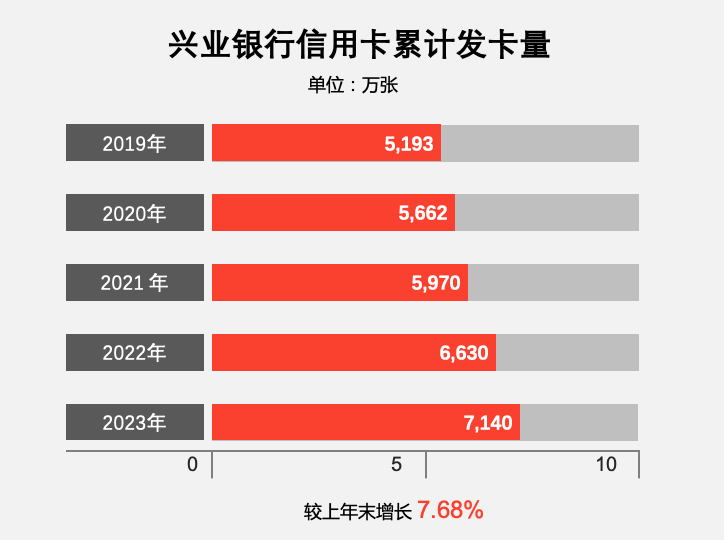 截至2023年末,兴业银行累计发行信用卡7,139.55万张,较上年末增长7.68%,报告期内新增发卡509.40万张;