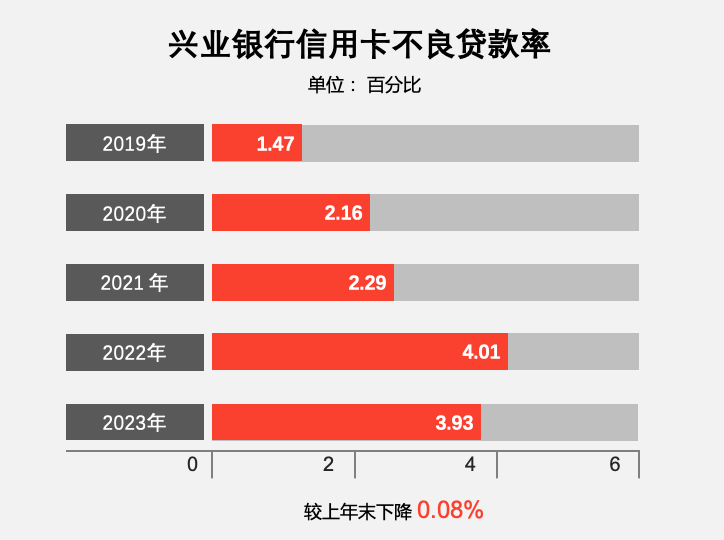 截至2023年末,兴业银行信用卡不良贷款率 3.93%,较上年末下降 0.08 个百分点,风险指标高位回落;