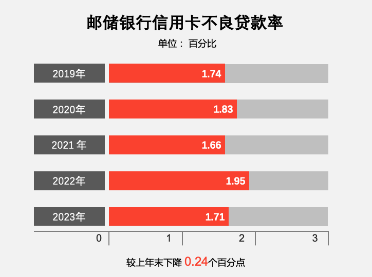 截至2023年末,邮储银行信用卡不良贷款37.45亿元,不良率1.71%,较上年末下降0.24个百分点。