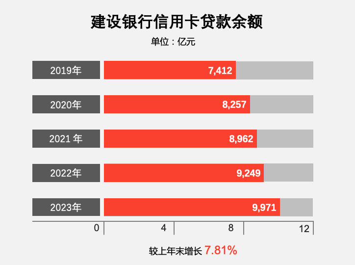 截至2023年末,建设银行信用卡贷款余额9,971.33亿元,较上年增加722.60亿元,增幅7.81% ;
