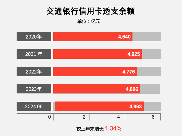 截至2024年6月末,交通银行信用卡透支余额4962.89亿元,较上年末增幅 1.34%;