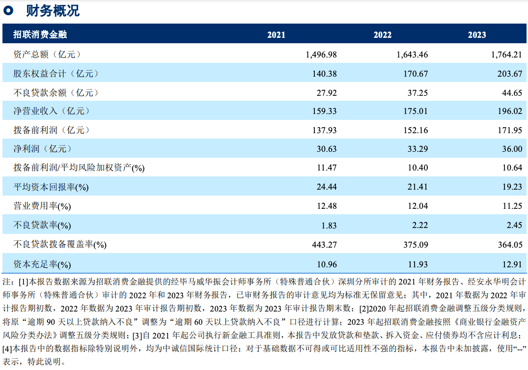 根据报告显示,截至2023年末,招联消费金融资产总额1764.21亿元,贷款余额为 1,821.27 亿元,同比增长 8.66%;不良贷款余额44.65亿元,不良贷款率2.45%,较2022年末上升了0.23个百分点;不良贷款拨备覆盖率为364.05%,资本充足率为12.91%,较2022年末上升了0.98个百分点。