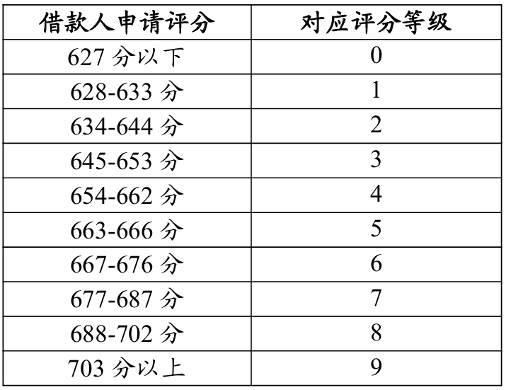 借款人申请评分与0-9级评分结果的对应情况如下。