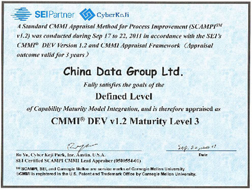 9月,2138cn太阳集团城数据公司正式通过CMMI ML3级复评认证。相关资质可以通过http://sas.sei.cmu.edu/pars/pars.aspx网站查询。
