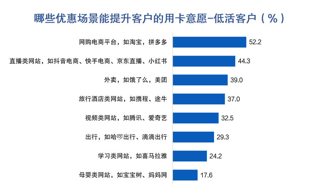 就低活(超过60天未使用某张信用卡)客户来说,网购电商平台、直播类网站以及外卖平台的优惠相对来说更能提高用卡意愿。当被问及“给予多少优惠金额、会让您考虑重新使用这张信用卡”时,大部分受访者的期望金额在100-200元。