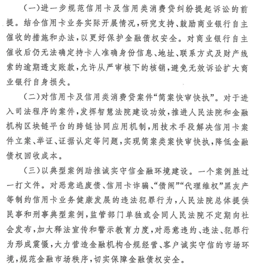 最后,为加强信用卡和信用类消费贷纠纷诉源治理,推动法治力量向引导和疏导端用力,切实维护金融安全和社会稳定,最高人民法院在前期充分调研论证基础上,拟就信用卡及信用类消费贷纠纷案件的办理出台诉讼规范,建议国家金融监督管理总局、中国人民银行结合相应管理举措从严实施,与最高人民法院联合发文,促进相关举措落地落实: