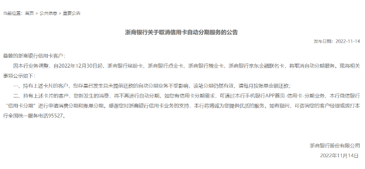 浙商银行表示,自2022年12月30日起,浙商银行缤纷卡、浙商银行点金卡、浙商银行增金卡、浙商银行京东金融联名卡,将取消自动分期服务。