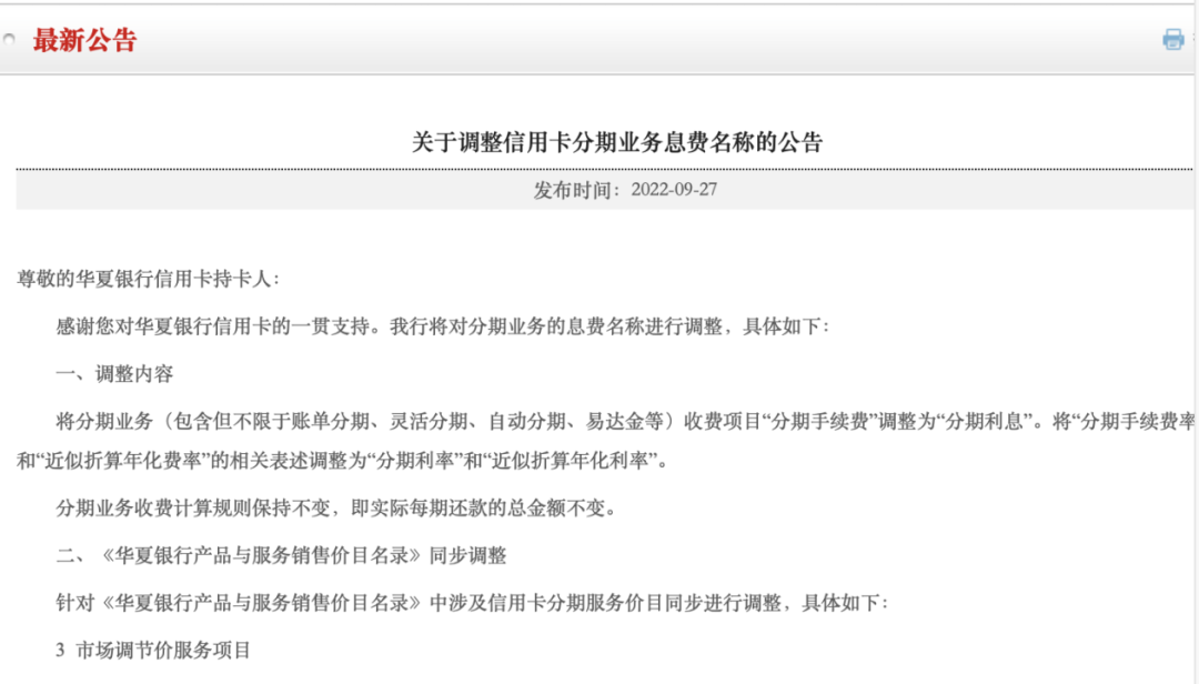 此外,中国银行、中信银行和华夏银行等多家银行都陆续发布了关于分期业务息费更名的公告。值得注意的是,华夏银行在公告中公示了调整后分期业务的年化利率区间,为0%-18.25%(单利)。