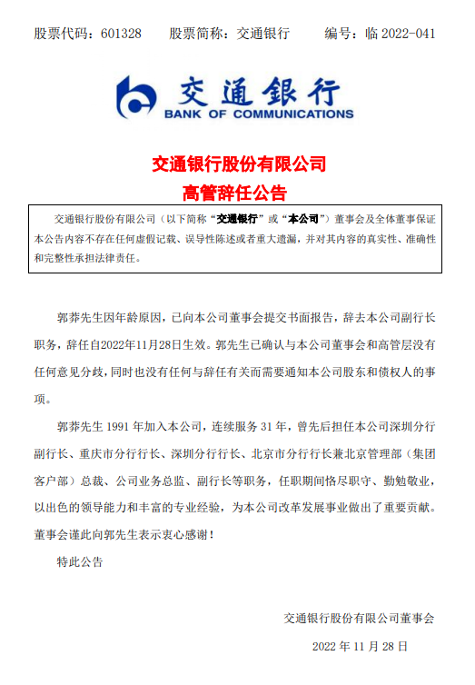 11月28日,交通银行发布公告称,副行长郭莽因年龄原因,已向该行董事会提交书面报告,辞去该行副行长职务,辞任自11月28日生效。郭莽已确认与该行董事会和高管层没有任何意见分歧,同时也没有任何与辞任有关而需要通知该行股东和债权人的事项。