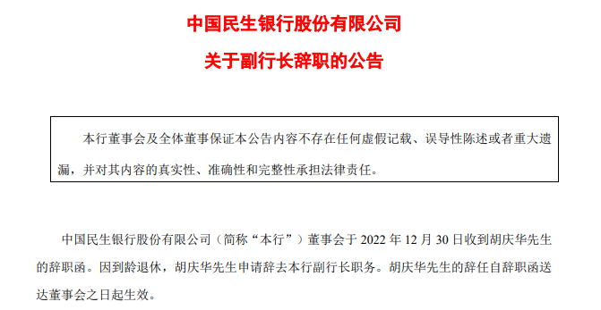 1月3日,民生银行发布公告称,该行董事会于2022年12月30日收到胡庆华的辞职函。因到龄退休,胡庆华申请辞去该行副行长职务。胡庆华的辞任自辞职函送达董事会之日起生效。