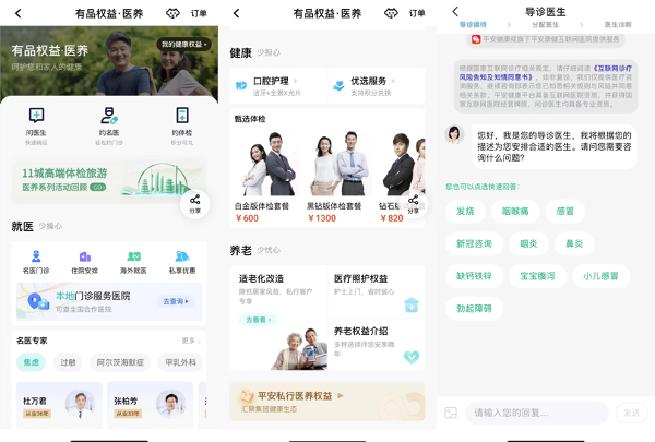 其在平安口袋银行APP推出了“医养权益”,包括就医问诊、名医专家、健康体检、养老四大服务。但服务人群仅限于私人银行等高净值服务,普通用户只能免费使用“问医生”服务,以及在健康专区买体检套餐。