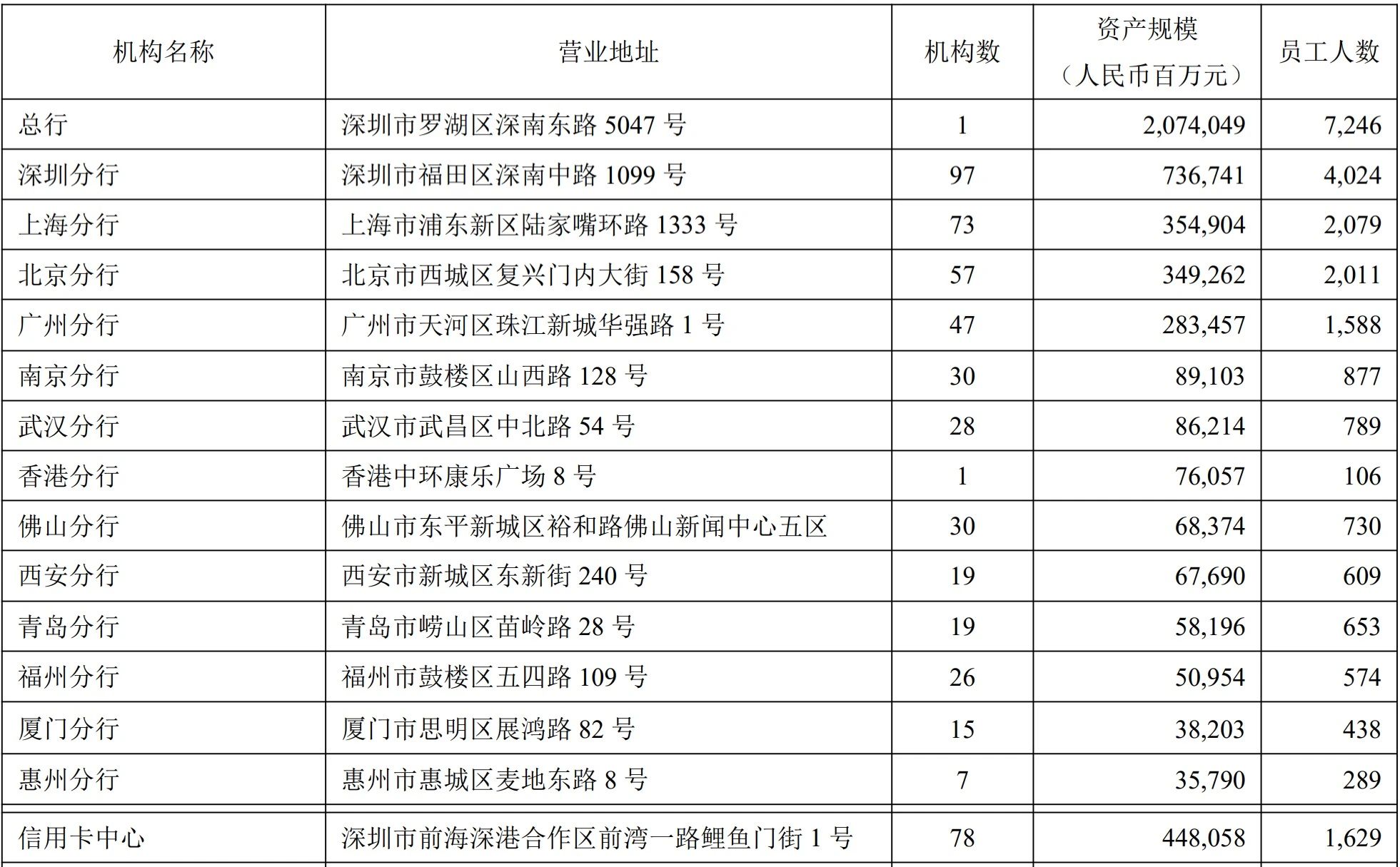 平安银行上述分支机构信息(2024半年报)