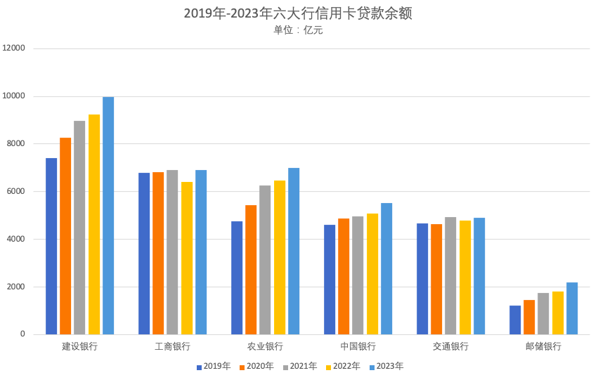 下面是2019年-2023年六大行的信用卡余额,可以看出,建设银行、农业银行和邮储银行均非常稳定地呈现阶梯式增长趋势,其中邮储银行信用卡余额在2023年突破2,000亿,年报中说明主要得益于深入推进信用卡体制机制改革,着力构建差异化发展优势,全面提升产品研发、客户拓展、客户经营、 渠道建设、风险管理等领域核心能力。