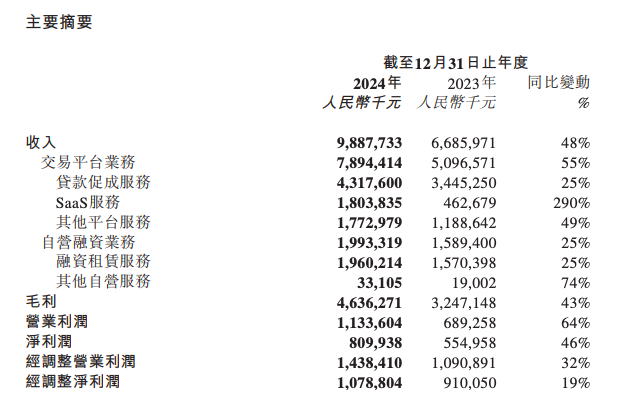 交易平台业务增长较亮眼。在报告期,交易平台业务产生的收入由2023 年的50.97 亿元同比增加 55%至 78.94 亿元,主要是由于 SaaS 服务及担保服务的收入增加。在报告期,交易平台业务占总收入的 80%。