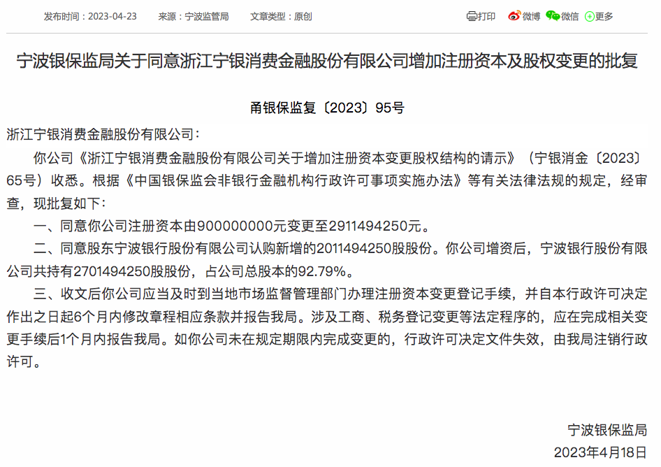 近日,宁波银保监批复了关于宁银消费金融增加注册资本变更股权结构的公告,宁银消金注册资金由9亿元增至29.1149425亿元,同意股东宁波银行股份有限公司认购新增的2011494250股股份,增资后,宁波银行股份有限公司共持有2701494250股股份,占其总股本的92.79%。
