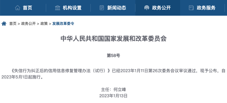 2023年1月13日,国家发展和改革委员会官网公布《失信行为纠正后的信用信息修复管理办法(试行)》(以下简称《管理办法》),该《管理办法》将从2023年5月1日起施行。