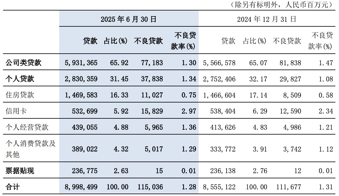 截至报告期末,集团不良贷款率1.28%,较上年末下降0.03个百分点,拨备覆盖率209.56%;个人贷款余额 28,303.59 亿元,较上年末增幅 2.83%,不良贷款率1.34%,其中: