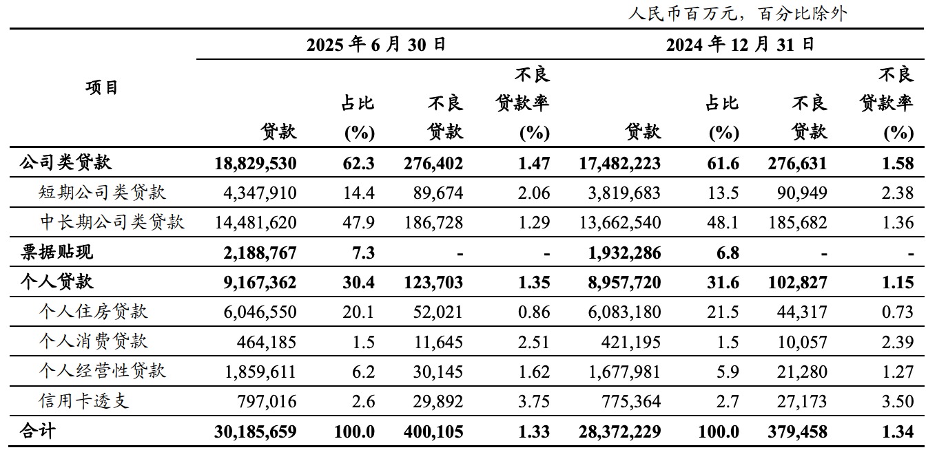 截至报告期末,集团下个人贷款91,673.62亿元,比上年末增长2.3%,占比30.4%;