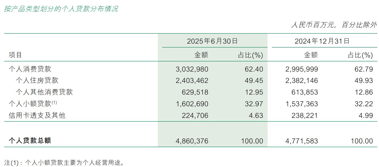 截至报告期末,邮储银行个人贷款总额48,603.76亿元,较上年末增加887.93亿元,增长1.86%。 其中,