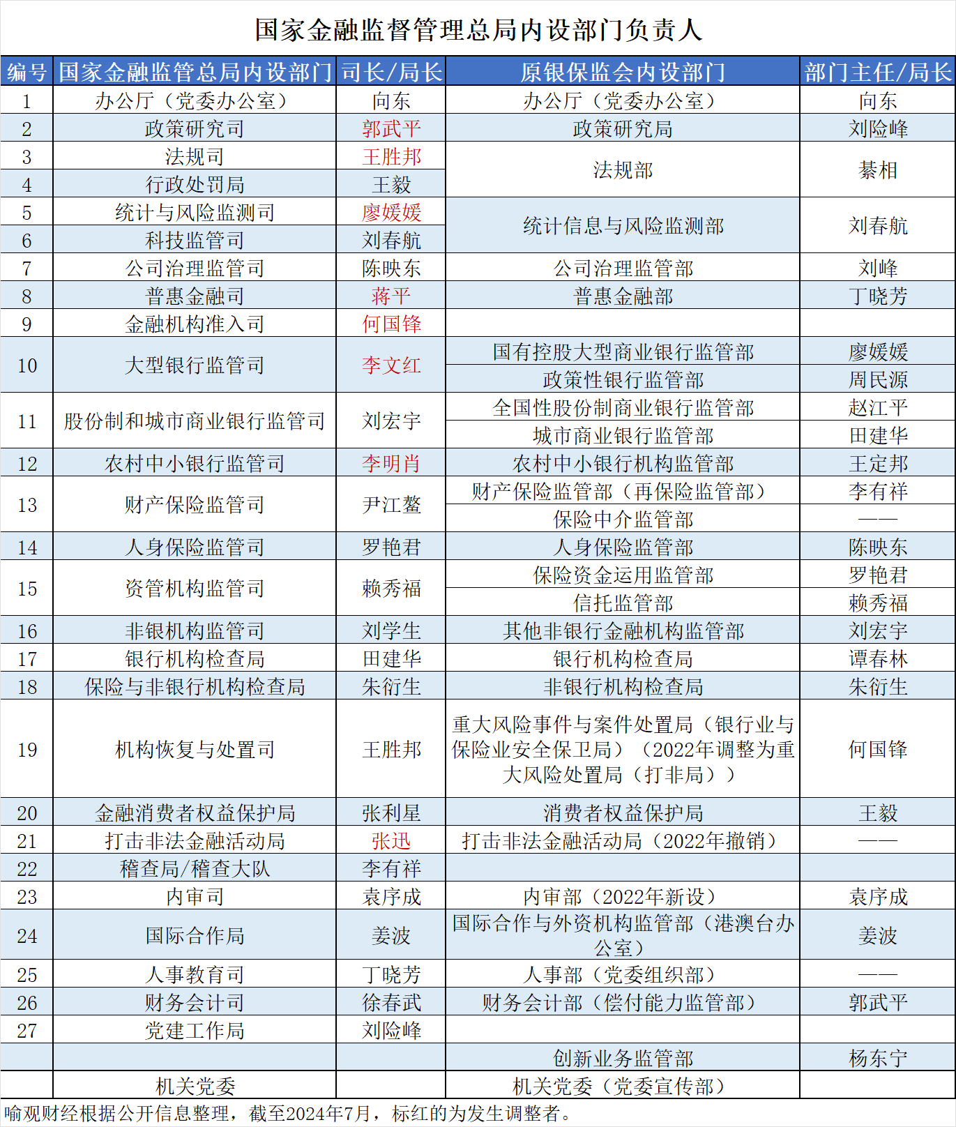 自2023年11月金监总局的 “三定”方案(即职能配置、内设机构和人员编制)发布以来,总局司局一把手已进行了一些微调。