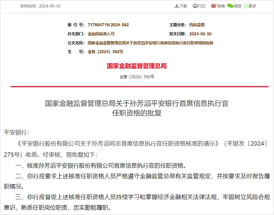 近日,国家金融监督管理总局批复显示,孙芳滔任平安银行首席信息执行官的任职资格获批。