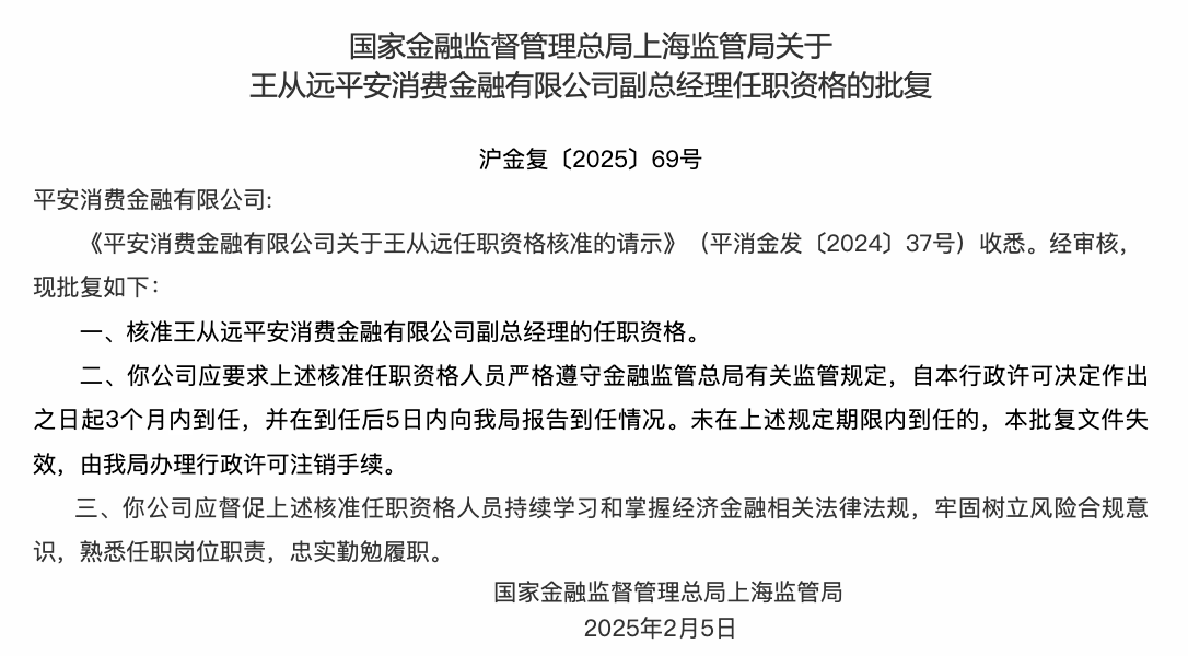 平安消费金融副总经理王从远任职资格获批