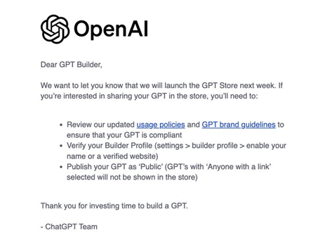 1月5日凌晨,OpenAI向所有自定义GPT开发者发布了一封邮件,下周将上线“自定义GPT商店”。自定义GPTs是OpenAI在去年首届开发者大会上发布的重磅产品,用户无需任何代码,全程支持可视化点击操作。用户只需要提交对话指令、额外的知识数据,然后选择是否需要网络搜索、数据分析和图片生成等多模态功能,就能快速开发法律、金融、医疗等特定领域的ChatGPT助手。而这个自定义GPT商店,就是让你开发的自定义ChatGPT助手进行分享,当有其他人使用你的产品时进行付费赚钱。相当于大模型领域的苹果“App Store”。其实这个自定义GPT商店,OpenAI打算在去年12月上线的,但是11月闹出了“罢免CEO事件”影响了整体开发进度。好在终于发布了,算是2024年第一个重磅功能,实实在在的为开发者谋福利。首先你需要开发一个自定义GPT助手,才能激活商店功能,下面是作者之前写的一个教程。1)登录https://chat.openai.com/auth/login注册一个Plus账号。2)注册完毕后登录账号,然后点击左上方的“Explore”按钮,进入自定义构建模式。3)接着会弹出一个页面,点击“Creat a GPT”就开始进行构建了。4)点击“Create”。然后在下方的对话框输入你想构建什么样的自定义GPT,例如,我们构建一个用于回复、阅读电子邮件的GPT助手。如果你希望自定义的GPT回复或执行一些更复杂的特定操作,可以点击那个附件按钮,上传额外数据。5)接着GPT Builder会让你为自定义助手起一个名字,例如,我们起一个VB邮箱助手,同时会通过DALL-E 3帮你生成一个助手头像,如果不喜欢可以自行修改,这一点非常人性化。然后点击“Configure”页面进行详细功能配置,是否需要添加 Web Browsing(联网功能)、Dall E(图片生成功能)和Code Interpreter(代码解析器功能),这里我们全部选择即可,就可以让你的助手实现多模态输出。关键部分来了,系统还会问你,是否将自定义的ChatGPT助手作为私有模型保存,可以只与自己的同事、公司内部分享。或者直接开放与全世界的人共享,这个就可以放到OpenAI即将发布的自定义GPT商店中进行赚钱。所以,如果你想放到自定义GPT商店中赚钱就选择分享模式,如果不希望别人使用或者看到就选择私有部署。自定义GPT商店有排行榜功能,使用的人越多,你的产品排名就越高。