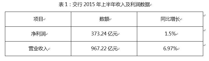 2015年8月8日,交通银行发布半年度业绩报告,根据交行半年度报告显示,该行的具体利润及收入数据如下表所示。