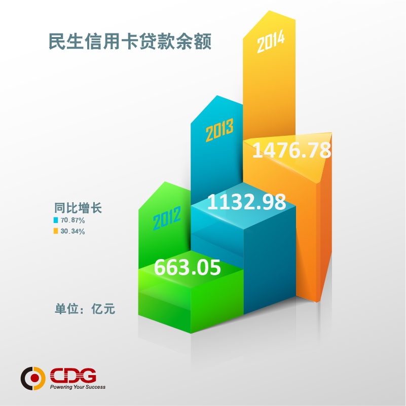 在信贷额度上,截至2014年末,民生信用卡贷款余额依然有较大幅度的增长,但增速较上年已有所下滑(见图二)。