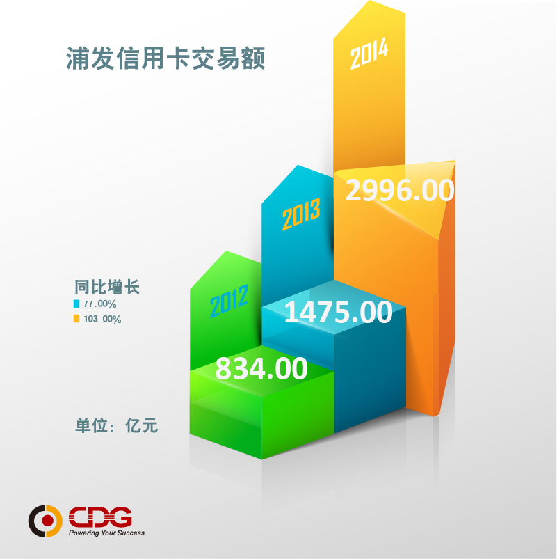 此外,浦发信用卡交易额在2014年实现翻番(见图三),该成绩与浦发信用卡推行的互联网营销和各类消费活动不无关系。