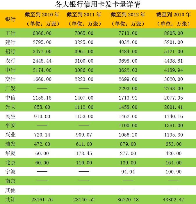 表1:各大银行2013年新增发卡量汇总(降序排列)