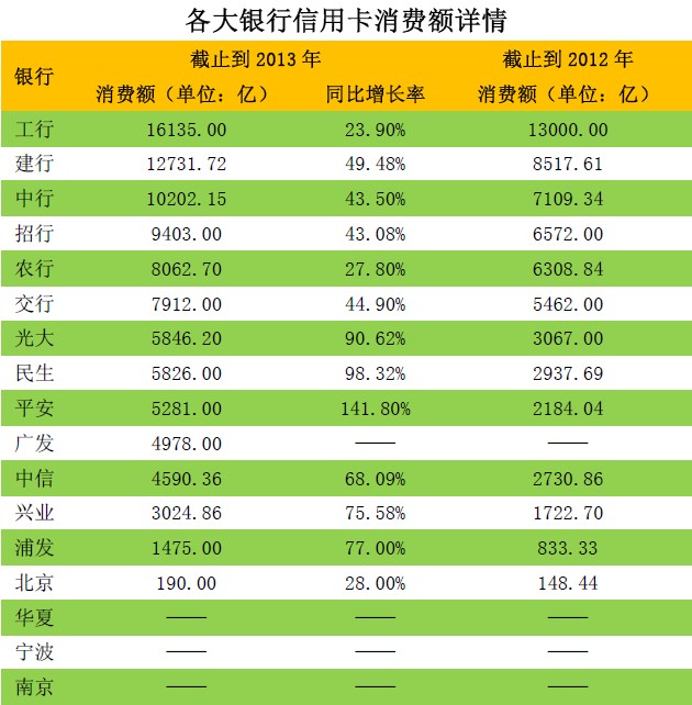 表5:各大银行信用卡消费额详情(2013年消费额降序排列)