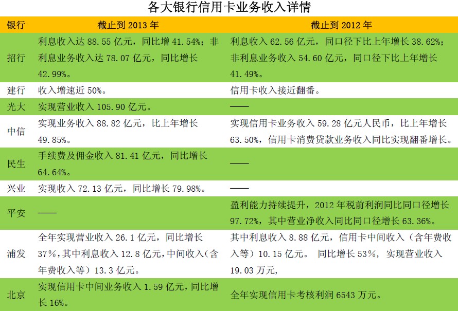 表7:各大银行信用卡业务收入及盈利状况汇总